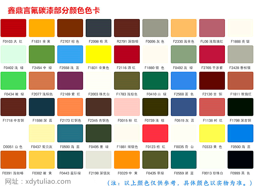 氟碳漆顏色有很多種,光澤上分為亮光,平光,啞光,無光;常用的金屬色氟碳漆顏色有:金色、銀白色、銀灰色,香檳銀、藍(lán)銀等,常用的氟碳漆實(shí)色有:大紅色、灰色、白色、中綠色、中黃色、藍(lán)色、紫色、桔紅色、黑色、酒紅色、棕色等?蛻艨梢赃x擇氟碳漆色卡有:歐標(biāo)RAL色卡(RAL國際色卡、勞爾色卡)、鑫鼎言氟碳漆色卡、國標(biāo)GSB漆膜顏色標(biāo)準(zhǔn)色卡(GSB05-1426-2001)、金屬漆色卡?蛻艨梢愿鶕(jù)底材