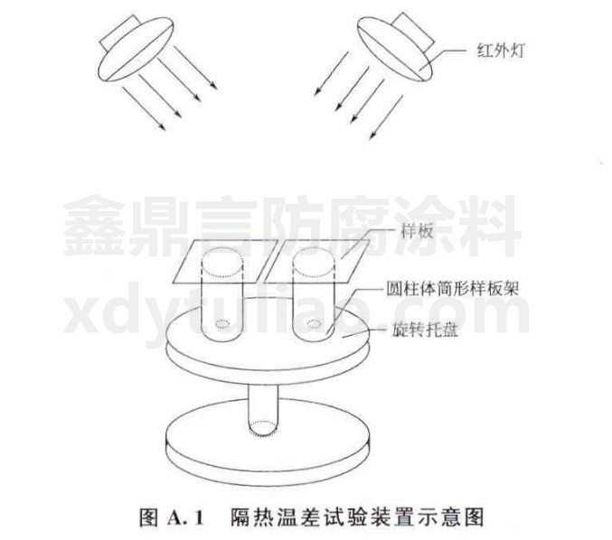 A.3.2、試驗在18℃—27℃的環(huán)境條件下進行。在旋轉(zhuǎn)托盤上放置圓柱體筒形樣板架,圓柱體筒形樣板架的中心應(yīng)對準托盤上圓孔的中心;將1塊試板及1塊空白試板放在圓柱體筒形樣板架上,兩塊板之間間隔5mm,試板有涂層的面向上,空白試板經(jīng)過噴砂或拋丸的面向上;在旋轉(zhuǎn)托盤的上方0.5m處,安裝2只紅外燈,紅外燈與旋轉(zhuǎn)托盤邊緣的水平距離為15cm,紅外燈的加熱面軸向與試板平面成75°。
