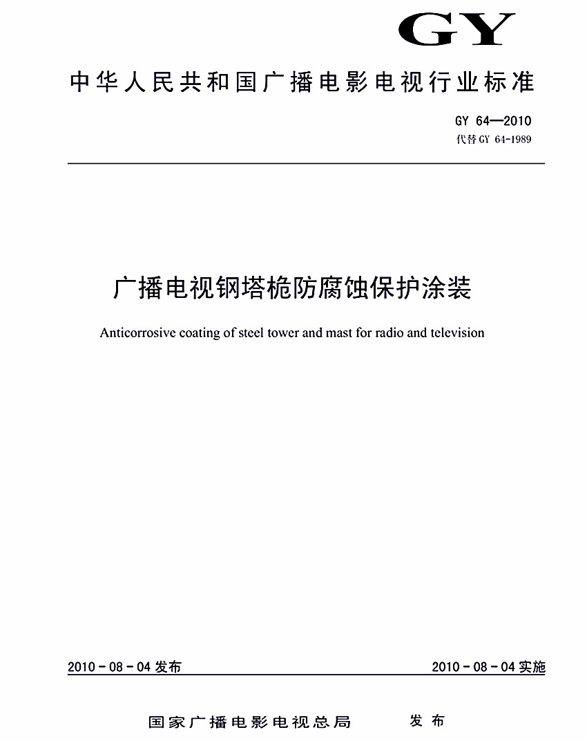 GY 64-2010 廣播電視鋼塔桅防腐蝕保護(hù)涂裝標(biāo)準(zhǔn)