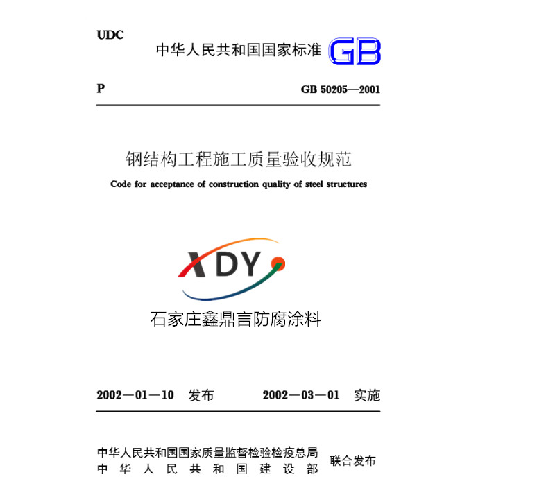 本文介紹了GB50205-2001鋼結(jié)構(gòu)工程施工質(zhì)量驗(yàn)收規(guī)范對(duì)于鋼結(jié)構(gòu)防腐涂料涂裝的表面處理要求,各類防銹漆、底漆對(duì)應(yīng)的最低除銹等級(jí)及防腐涂料的涂層厚度、驗(yàn)收標(biāo)準(zhǔn)。專業(yè)的XDY鋼結(jié)構(gòu)防腐漆生產(chǎn)廠家為您提供質(zhì)量?jī)?yōu)異,價(jià)格合理的XDY鋼結(jié)構(gòu)防腐涂料全系列產(chǎn)品。