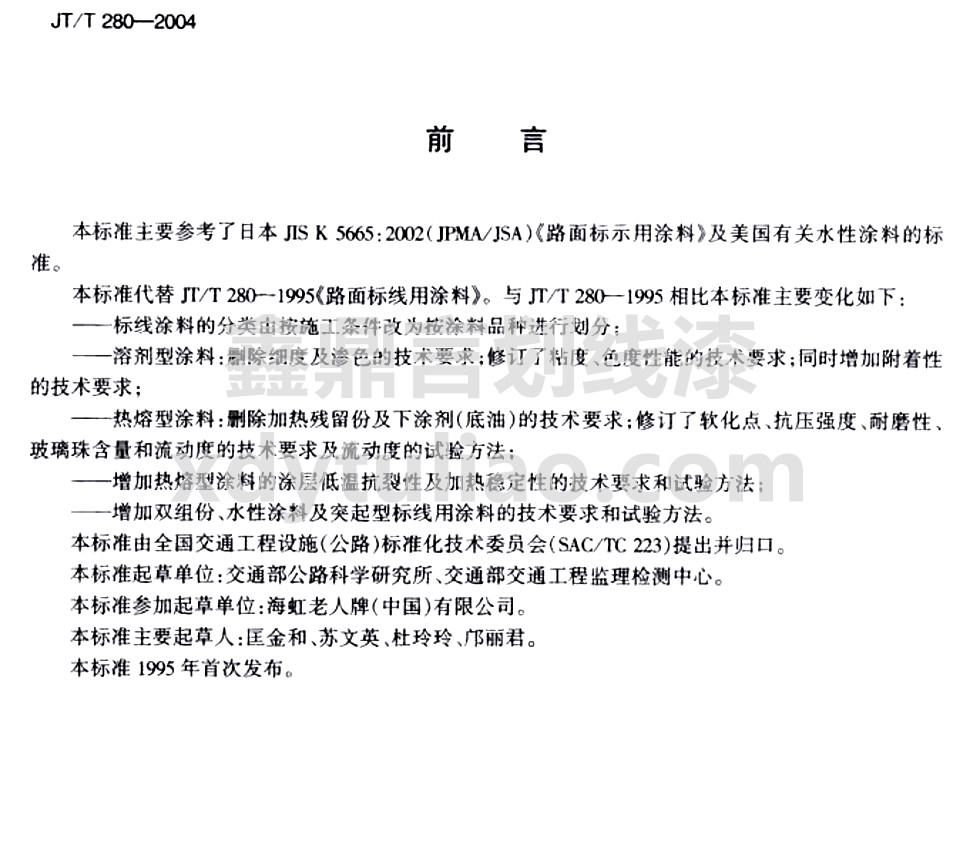 JT/T 280-2004路面標(biāo)線(xiàn)涂料Pavement marking paint