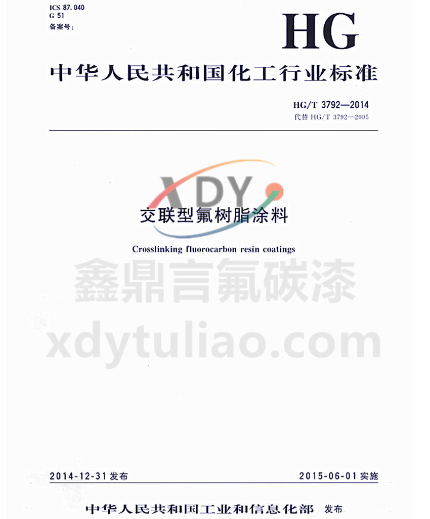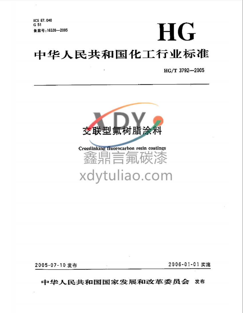 中華人民共和國化工行業(yè)標(biāo)準(zhǔn)HG/T3792-2014交聯(lián)型氟樹脂涂料替代HG/T3792-2005 本標(biāo)準(zhǔn)根據(jù)交聯(lián)型氟樹脂涂料的主要應(yīng)用領(lǐng)域分為3種類:Ⅰ型為建筑外墻用氟樹脂涂料;Ⅱ型為橋梁、儲(chǔ)罐等混凝土設(shè)施表面用氟樹脂涂料;Ⅲ型為鋼結(jié)構(gòu)等金屬表面用氟樹脂涂料。 常溫交聯(lián)型氟碳漆按化工行業(yè)標(biāo)準(zhǔn)HG/T3792-2014交聯(lián)型氟樹脂涂料執(zhí)行,性能達(dá)到標(biāo)準(zhǔn)中的技術(shù)要求
