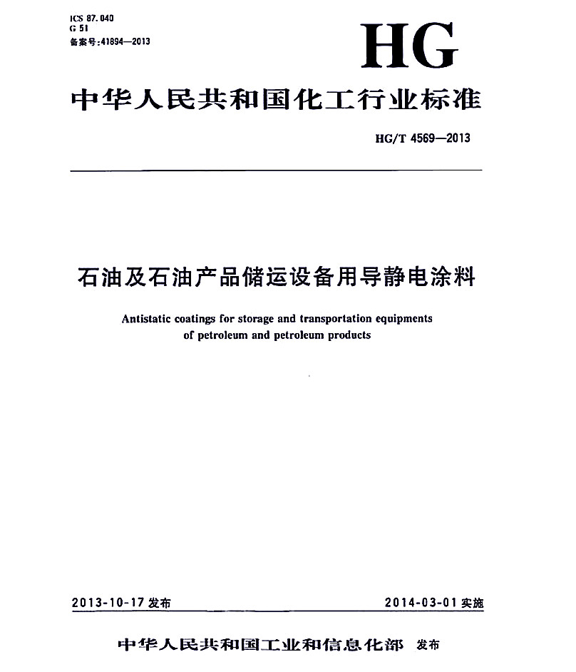 HG/T 4569-2013石油及石油產(chǎn)品儲(chǔ)運(yùn)設(shè)備用導(dǎo)靜電涂料標(biāo)準(zhǔn) ICS87.040 G51 備案號(hào):41894-2013 HG 中華人民共和國(guó)化工行業(yè)標(biāo)準(zhǔn) HG/T 4569-2013石油及石油產(chǎn)品儲(chǔ)運(yùn)設(shè)備用導(dǎo)靜電涂料 Antisocial coatings for storage and transportation equipments of petroleum and petroleum